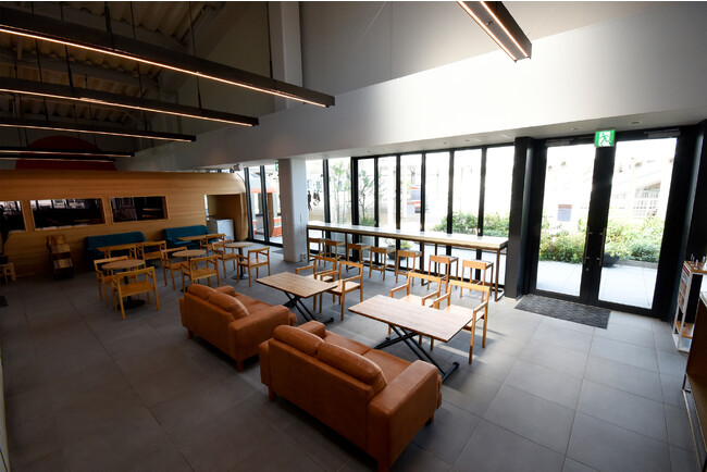 海老名駅につながるペデストリアンデッキに面したガラス戸はフルオープン可能で、開放感も抜群。さっと立ち寄って利用できるカウンター席やゆっくりくつろげるソファ席を配置し、ロマンスカーのように、日常利用もできながら特別感を味わえる空間となっております。