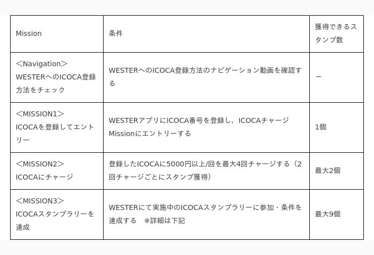 ※WESTERポイントのプレゼントには、本キャンペーン終了時点でWESTERアプリにICOCA番号を登録してエントリー(Mission1のスタンプ達成)が必要です。