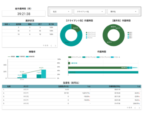 時間軸(日・週・月ごと)での表示、個人ごとの生産性など、データを可視化できます