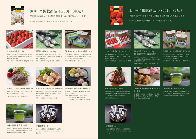 ・掲載商品例:「泥付き白石れんこん」、「牧場プリン」、「大玉 さがほのか」、「佐賀牛ハンバーグステーキ」など