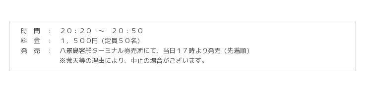 「花火シンフォニア -meets Sky Light Magic-」の開催に合わせて、うみファーム内に停泊している客船「おおわだ」の後部デッキをプレミアムな花火観覧席スペースとして1日1組限定で提供いたします。誰よりも近くで繰り広げられるプロジェクション映像と花火のストーリーを、ディナーとドリンク(アルコールを含む)に舌鼓を打ちながら存分にお楽しみいただけます。特別な方と一緒に過ごす大切なひとときに是非ご利用ください。