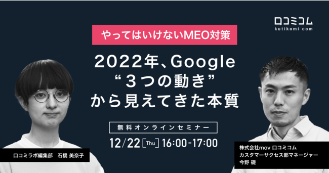 そこで本セミナーでは、こうしたGoogleのアップデートを常に注視し、情報発信・サポートを続けている「口コミコム 」が、2022年のGoogleの動きから見えてくる「やってはいけない"MEO対策"」について語ります。