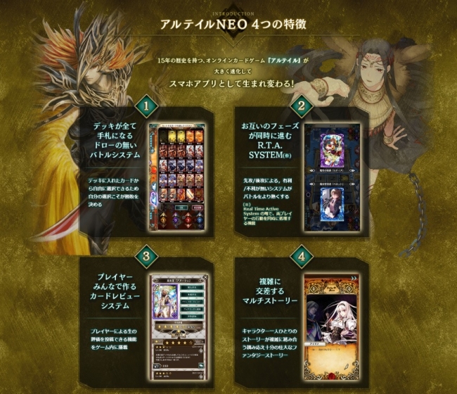 『アルテイルNEO』は、2018年10月25日(木)11:00からAndroid・IOSにてサービスを開始することを決定いたしました。本作は、「デッキが全て手札」、「先攻後攻がない」、「ライフポイントは自分で決める」等といった独特な特徴がある戦略性の高いボードゲーム型のカードゲームです。自由度が高いデッキ構築や、幅広い戦略により今まで体感したことのない深い駆け引きが楽しめる内容となっております。またカードゲームでありながら、キャラクター1人ひとりに物語があります。ラヴァ―トと呼ばれるファンタジーな世界を舞台に、キャラクター同士の思惑や陰謀が複雑に絡み合う群像劇も目が離せません。本格カードバトルや奥深いストーリーが楽しめる『アルテイルNEO』を是非お楽しみにお待ちください!