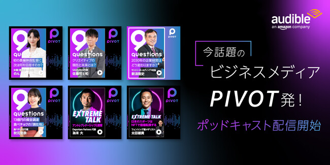 Audibleでは今回、PIVOTが配信する200シリーズ超のコンテンツの中でも特に人気の、「経済の未来は、最前線に聞け。」をスローガンに、PIVOT CEO 佐々木紀彦さんとチーフ・グローバルエディター 竹下隆一郎がタッグを組み、注目のビジョナリーたちの視座や展望、その基となるスキルセットを、9つの質問から解き明かすインタビュー番組「9 questions」やビデオポッドキャスト形式でゲストを招き、最先端の話を聞く「EXTREME TALK」の動画を音声化。