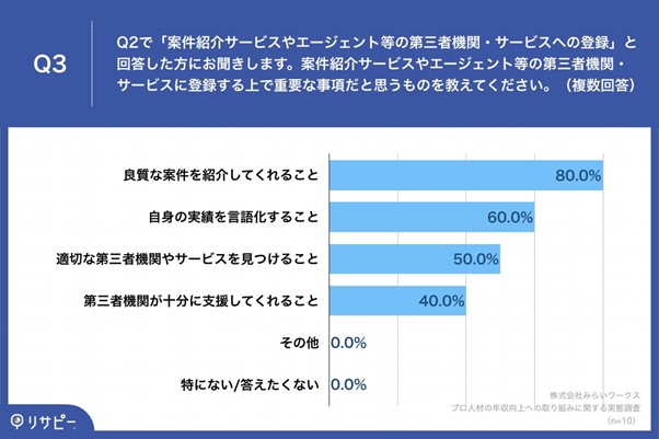 Q2で「案件紹介サービスやエージェント等の第三者機関・サービスへの登録」と回答した方に、「Q3.案件紹介サービスやエージェント等の第三者機関・サービスに登録する上で重要な事項だと思うものを教えてください。(複数回答)」(n=10)と質問したところ、「良質な案件を紹介してくれること」が80.0%、「自身の実績を言語化すること」が60.0%、「適切な第三者機関やサービスを見つけること」が50.0%という回答となりました。