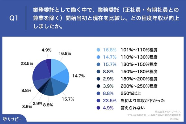 「Q1.業務委託として働く中で、業務委託(正社員・有期社員との兼業を除く)開始当初と現在を比較し、どの程度年収が向上しましたか。」(n=102)と質問したところ、「101%〜110%程度」が16.8%、「130%〜150%程度」が15.7%という回答となりました。