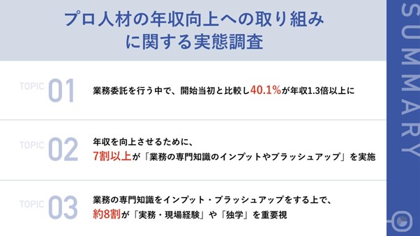 年収を向上させるためにさまざまな取り組みを実施し、年収が1.3倍以上になったと回答する人も一定数いるものの、彼らの多くが、実務・現場経験や独学による業務の専門知識のインプットやブラッシュアップ、知人との継続的なコンタクトを通じた人脈形成など、個々人の努力によって年収向上を図っているようです。昨今の多様な働き方が進む中、プロ人材として業務委託として働く人も増えていますが、今後より多くの業務委託人材が満足のいく年収で働いていけるようになるためには、年収向上に繋がる学びや案件獲得の仕組みを提供するプラットフォーマーの存在が鍵になるのかもしれません。