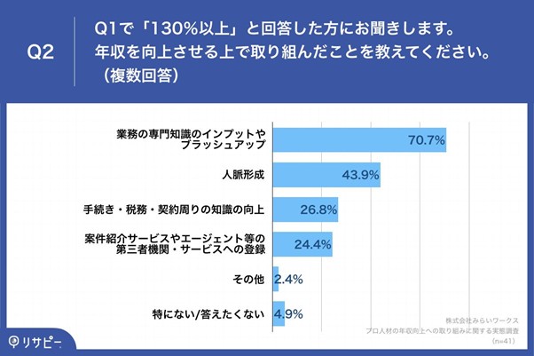 Q1で「130%以上」と回答した方に、「Q2.年収を向上させる上で取り組んだことを教えてください。(複数回答)」(n=41)と質問したところ、「業務の専門知識のインプットやブラッシュアップ」が70.7%、「人脈形成」が43.9%、「手続き・税務・契約周りの知識の向上」が26.8%という回答となりました。