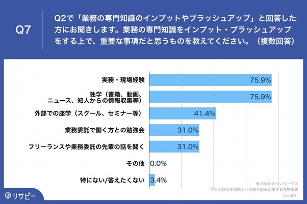 Q2で「業務の専門知識のインプットやブラッシュアップ」と回答した方に、「Q7.業務の専門知識のインプット・ブラッシュアップをする上で、重要な事項だと思うものを教えてください。(複数回答)」(n=29)と質問したところ、「実務・現場経験」が75.9%、「独学(書籍、動画、ニュース、知人からの情報収集等)」が75.9%、「外部での座学(スクール、セミナー等)」が41.4%という回答となりました。