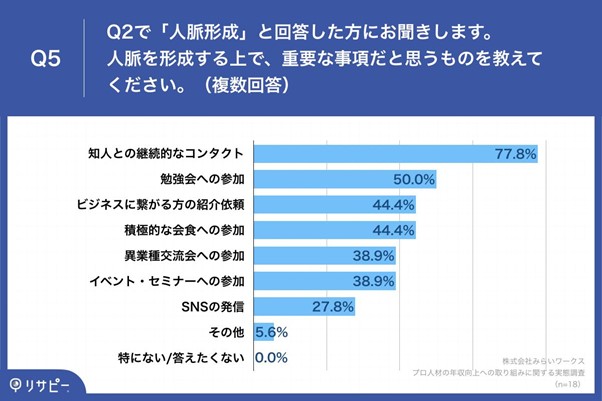 Q2で「人脈形成」と回答した方に、「Q5.人脈を形成する上で、重要な事項だと思うものを教えてください。(複数回答)」(n=18)と質問したところ、「知人との継続的なコンタクト」が77.8%、「勉強会への参加」が50.0%、という回答となりました。