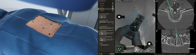 様々な術中撮影装置がある中で、ハイブリッド手術室は短時間で高画質な3D画像(Cone-Beam CT撮影画像)が入手でき、詳細な解剖やスクリュー位置を術中に容易に確認できます。また、装置の柔軟性やワークフローに合わせた使い勝手も高い評価を得ています。脊椎手術ではそこからさらなる精度の向上と患者被ばく低減のため、手術用ナビゲーションシステムとの併用も導入が進み始めています。ナビゲーションシステムに患者の脊椎3D情報を事前に取り込むことで、術中にX線を使用することなく、表示されたガイダンスに沿ってのスクリューの留置が可能となります。しかし、撮影装置とナビゲーション装置がそれぞれ必要であることや、侵襲的なレファレンスフレームが必要であることなど既存のものでは使い勝手や精度にはまだまだ課題が見られ、市場では新たなソリューションが求められてきました。