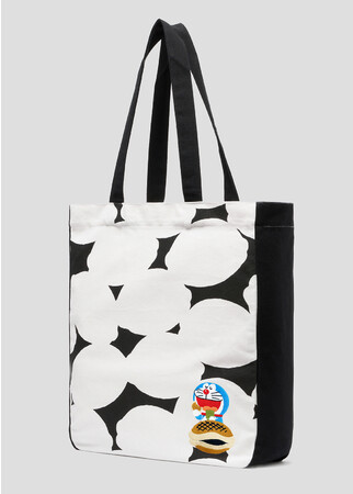 どら焼きのシルエットを並べたパターン柄。美味しそうにどら焼きを頬張るドラえもんの姿をフロントにデザインしました。キャンバス生地を使用し、マチ付きで雑誌やノートパソコンも入る少し大きめサイズのトートバッグ。手提げや肩掛けにも対応。内側にはポケットがあり、イヤホンやパスケース、スマートフォン等の小物を収納できます。