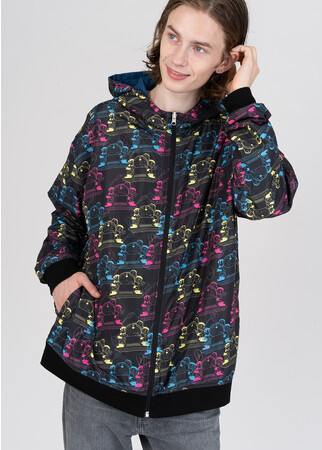 「タイムマシン」に乗るドラえもんとのび太のシルエットをワンポイント刺繍にしたシンプルな面と、「タイムマシン」に乗ったドラえもん、のび太、しずかちゃん、ジャイアン、スネ夫のパターン柄が賑やかな面のリバーシブルデザイン。1枚で2パターンの着こなしが楽しめます。軽くて保温性の高い中綿入りで片面は裏毛と布帛のコンビ使いがポイント。
