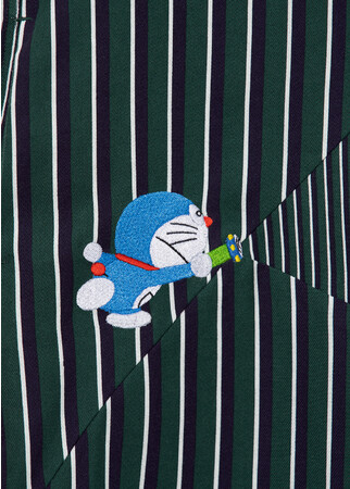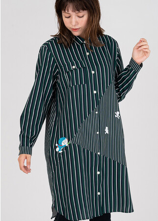 ドラえもんがひみつ道具「スモールライト」で、のび太、しずかちゃん、ジャイアン、スネ夫を小さくしているのを刺繍と生地の切り替えで表現したユニークなデザイン。ツイル生地を使用したベーシックな長袖シャツワンピースでサイドポケット付き。