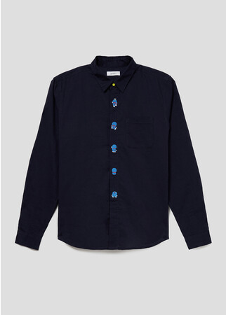 後ろ姿のドラえもんが、まるでボタンのように刺繍されています。首元の第1ボタンが鈴のデザインになっているのもポイントです。風合いの良いオックス生地を使用したベーシックな長袖シャツ。