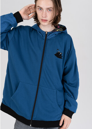 ひみつ道具「雲かためガス」でドラえもんが固めた雲の上にお昼寝をするのび太としずかちゃんの面と、まるで雲のようなボアの生地に「雲かためガス」を使っているドラえもんを刺繍した面のリバーシブルデザイン。着回しのきくリバーシブル仕様は、表と裏で違う雰囲気が楽しめます。裏毛とボリュームのあるボアを使用し、両サイドにはポケットが付いていてフロントはファスナー開きの仕様。