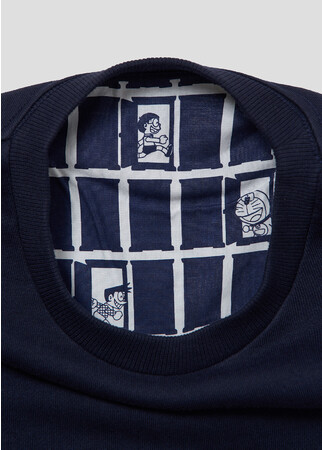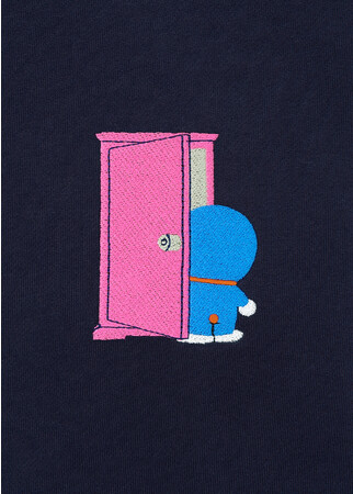 フロントにはひみつ道具「どこでもドア」に入るドラえもんの後ろ姿を刺繍でデザイン。背当てのデザインは、「どこでもドア」から出てくるドラえもん、のび太、しずかちゃん、ジャイアン、スネ夫のパターン柄でシャツ生地を使用しています。風合いの良い裏毛を使用したベーシック型のクルーネックスウェット。