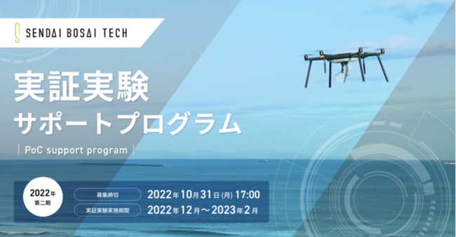 仙台市では、“防災×テクノロジー×ビジネス”を融合した防災課題に対する新たな解決策を持続的に生み出す場として、「仙台BOSAI-TECH イノベーションプラットフォーム」を運営しており、このプラットフォームを通じて「仙台防災枠組」の理念の実現を目指しています。本プログラムは、仙台BOSAI-TECHの活動に参加する企業が“防災×テクノロジー×ビジネス”による新しい解決策の事業化・社会実装を進めるための実証実験の実施に係る各種支援を仙台市が行うものです。