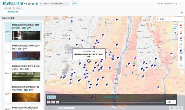 「FASTALERT」は、AI(人工知能)がSNSやNewsDigestから災害、事故、事件などの情報を自動収集し、デマ情報の排除・位置情報の推定を経てリアルタイムでWeb配信するリスク情報提供サービスです。2016年9月のリリース後7ヶ月で、全ての民放キー局とNHKで採用。各局ニュース番組における「視聴者提供」動画定着の原動力になりました。2018年の日本新聞協会 技術開発奨励賞を受賞。 現在はビッグデータリスク情報SaaSとしてシェアNo.1の業界標準として、全国の大半のテレビ局や新聞社に採用されているほか、警察、消防、自治体、一般企業等でも幅広い導入実績があります。