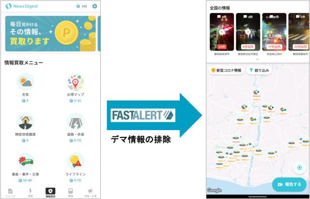 NewsDigestは、報道価値の高いニュースをAIで速報提供するニュースアプリです。NewsDigestの特徴のひとつに、身の回りのリスク情報を投稿することのできる『情報提供機能(https://ugc.newsdigest.jp/about) 』があります。NewsDigestから投稿された情報やTwitter等のSNSに投稿された情報は、デマ情報をAIで自動的に排除する仕組みを有するAI危険情報リアルタイム配信サービス「FASTALERT」で解析された後、NewsDigestの『コロナ・防災マップ』でリアルタイムに閲覧することができます。