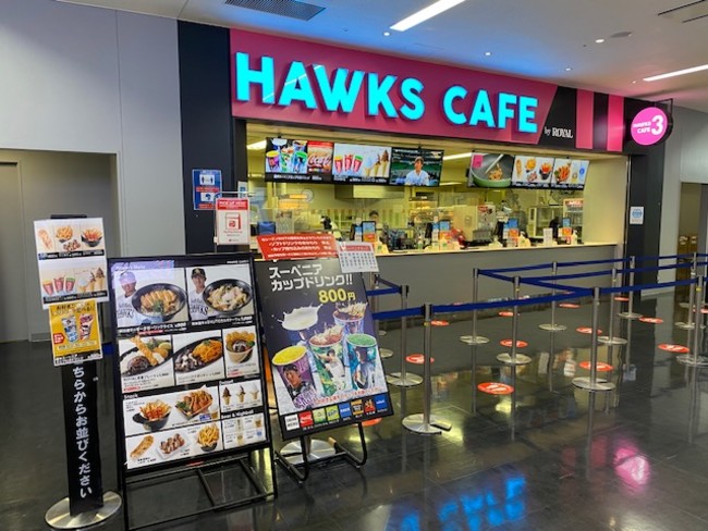ホークスカフェ3(3ゲート)、コカ・コーラ(1ゲート)、ソフトドリンク飲み放題ワゴン(27-28通路間)