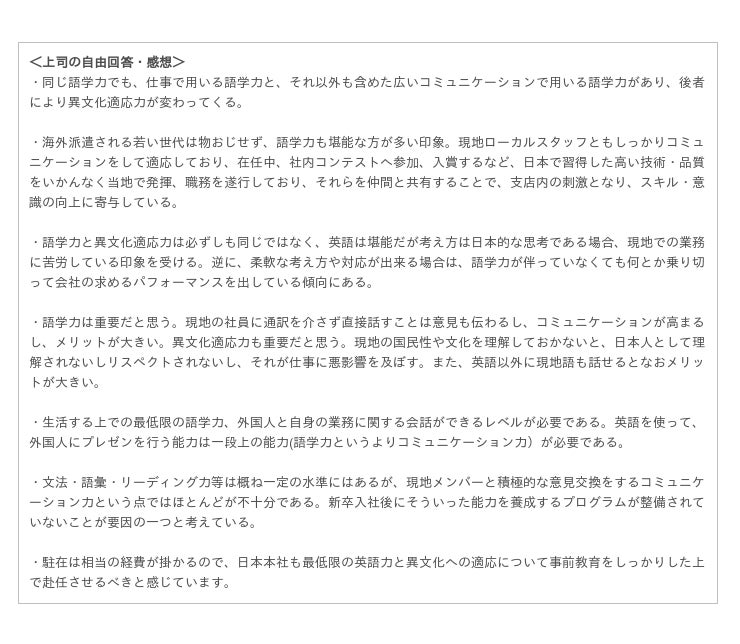 この結果から、海外赴任予定者は、事前にある程度の英語力を身に付けた上で赴任することで、現地でコミュニケーションに自信を持って仕事に取り組めるため高いパフォーマンスが期待できると考えられます。そのためにも、赴任前の英語研修でしっかりと準備をし、不安を取り除くことが重要となってくるのではないでしょうか。