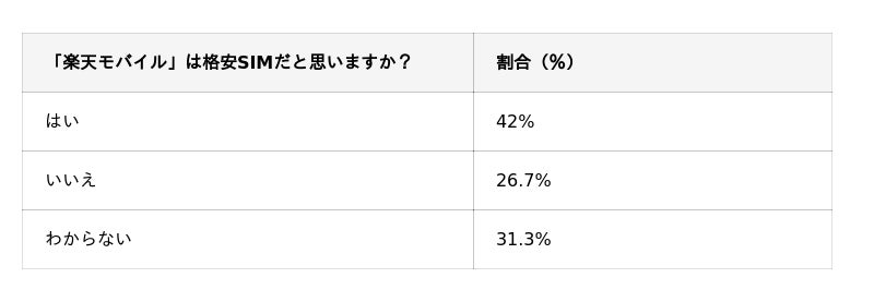 「楽天モバイルは格安SIMだと思いますか?」という問いに対して、42.0%のユーザーが「はい」と回答しました。一方、「いいえ」は26.7%、「わからない」は31.3%という結果となっています。