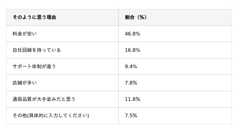 楽天モバイルを格安SIMと認識する最大の理由は、「料金が安い」(46.8%)というシンプルかつ直感的な評価に基づくものでした。次いで、「自社回線を持っている」(16.8%)、「通信品質が大手並み」(7.7%)といった要素も一定の支持を集めましたが、料金以外の視点はごく少数派にとどまっています。