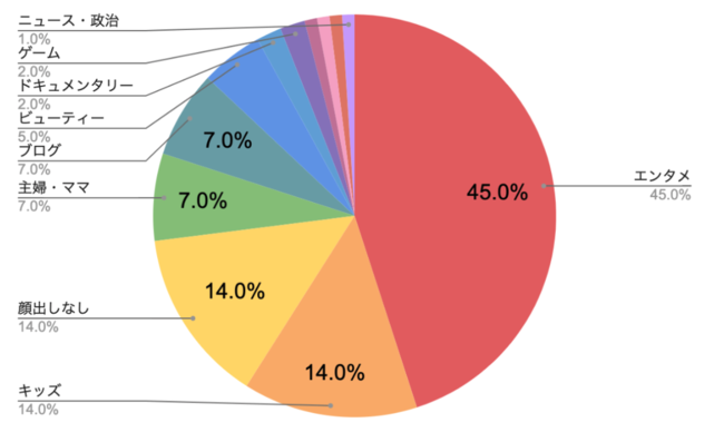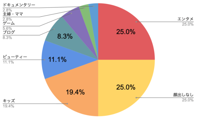 また、上位100件のうちYouTubeチャンネルのカテゴリ(当社独自分類)は下記のようになりました。もともとYouTube全体で規模の大きい「エンターテインメント」や「キッズ」カテゴリが合わせて6割近くを占めていますが、「顔出しなし」のカテゴリのYouTubeチャンネルも多く見られました。