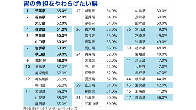 47都道府県「胃の負担県ランキング」を発表 胃の負担をやわらげたい県1位は、「千葉県」と判明