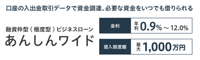 「あんしんワイド」は、事業拡大を目指す成長フェーズにおられる法人のお客さまからのご要望にお応えしスピーディーな資金調達を実現するビジネスローンです。銀行口座の直近7カ月以上連続した入出金データをもとに融資審査を行い、ご契約後は、インターネットバンキングからのお手続きのみで事業運営に必要な資金をお借り入れいただけます。