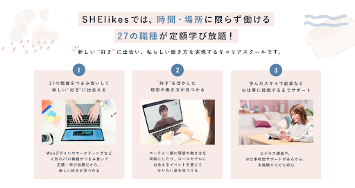 SHElikesは、Webデザイン・Webマーケティング・ライティングなどPC一つで働ける27種のクリエイティブスキルを幅広く学び、今の時代に求められるマルチクリエイターを育成して、時間や場所に縛られない賢く私らしい働き方を実現するためのキャリアスクールコミュニティです。