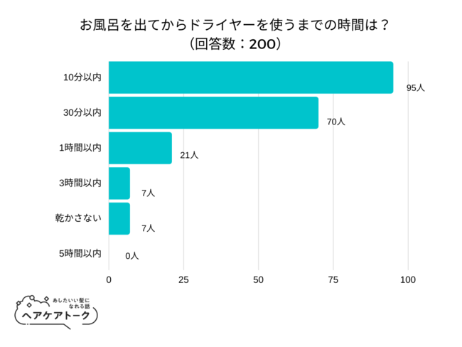 「お風呂を出てからドライヤーを使うまでの時間は?」とアンケート調査した結果、1位は『10分以内』でした。