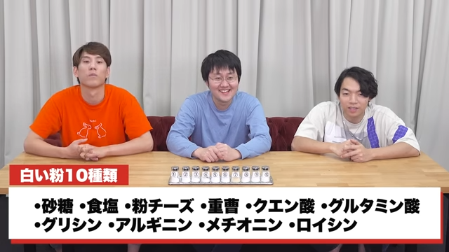 QuizKnockの伊沢拓司、鶴崎修功、須貝駿貴が10種類の粉末が何かを当てるクイズに挑戦。粉末の種類は、砂糖や食塩、粉チーズなど日常的になじみのあるものから、アミノ酸であるアルギニン、メチオニン、ロイシンなど聞き慣れないものまでさまざま。