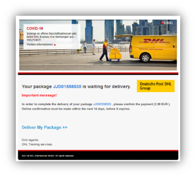 図1:「[reminder] Your package JJD01558535 is waiting for delivery. 851870943821843353 ([リマインダー]あなたの荷物JJD01559535は配送待ちです)」という件名の悪質