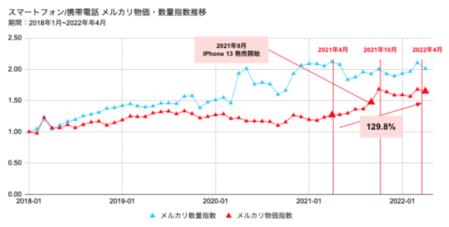 スマートフォン/携帯電話の物価指数は、前年同月比で約1.3倍増。「メルカリ」上のスマートフォン取引件数は「iPhone 12 本体」がトップ、前年同月比約6倍