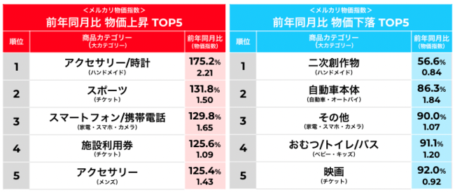 ハンドメイドカテゴリーの「アクセサリー/時計」の物価指数が過去最高に。2021年9月以降、スマートフォン/携帯電話の物価指数が上昇、前年同月比約1.3倍