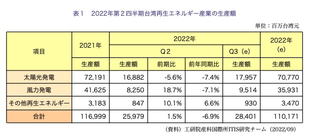 台湾再生可能エネルギー産業の2022年第2四半期の生産額は259億8000万台湾元で、前期比1.5%増、前年同期比6.9%減だった。カテゴリー別では以下の通り。