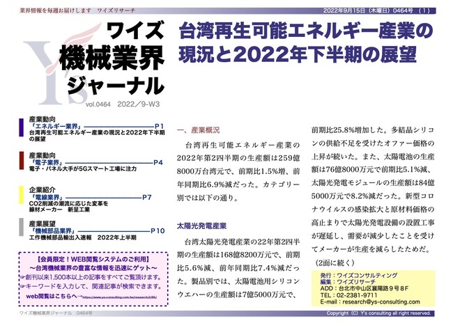 【台湾情報】台湾再生可能エネルギー産業の現況と2022年下半期の展望<ワイズ機械業界ジャーナル2022年9月第3週号発行>