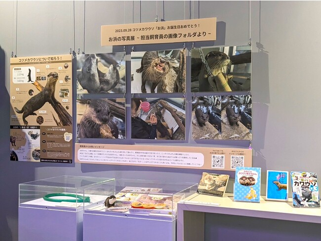 誕生日に合わせて館内にお浜の写真や愛用おもちゃを展示するほか、コツメカワウソ生態を解説パネルで紹介する特別展示ブースを設置しています。