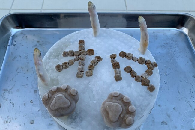 お客様に見守られながら、まずは氷で作った「ケーキ」をプレゼント。お浜の大好物で作られた氷のケーキは、とてもおいしそうに食べる様子が見られました!