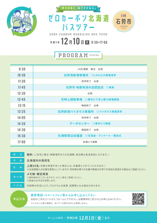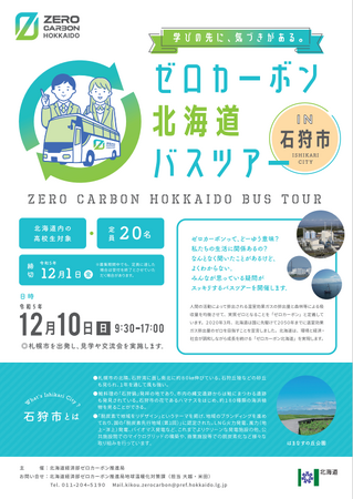 道内の高校生がゼロカーボン北海道等を学ぶうえで、脱炭素の先進的な事例を視察することで、環境に対する理解を深め、自ら学習するためのきっかけの一助とするため、道内高校生向けバスツアーを開催します。