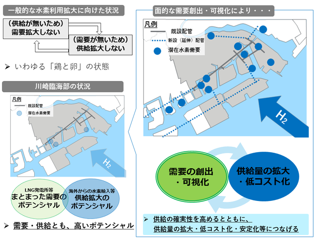 これらの取組により、水素の利用拠点の形成を加速することで、水素の供給量拡大や関連する技術開発の促進につなげ、水素の需要と供給双方の拡大という好循環の創出を目指します。