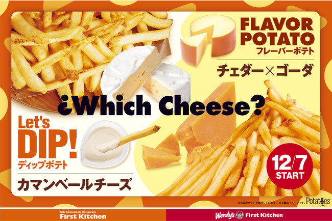 ウェンディーズ・ジャパン株式会社及び、ファーストキッチン株式会社 (所在地:東京都新宿区、代表取締役:紫関修) は、12月7日(木)から、ウェンディーズ・ ファーストキッチンとファーストキッチン(競馬場店を除く)で、寒い冬にぴったりなディップポテト「カマンベールチーズ」と、フレーバー(味付き)ポテト「チェダー×ゴーダチーズ味」を発売します。ディップポテトは今年の3月から販売を開始し、さまざまな味が楽しめるとしてお客様から大変好評をいただいております。付属のソースは単品(50円)でも購入が可能です。また、当社の看板商品であり大人気のフレーバーポテトは、今回の「チェダー×ゴーダチーズ味」で132種類目のフレーバーとなります。おすすめの食べ方提案は、フレーバーポテト+ディップソースの組み合わせ!チェダー×ゴーダチーズの味わいと、チーズの濃厚さと香りが楽しめるカマンベールチーズソースは最強コンビです。既存メニュー「スモークチーズ」との相性もばっちりです。ぜひお気に入りのフレーバーとディップソースをチョイスして、自分好みの味わいをお楽しみください。