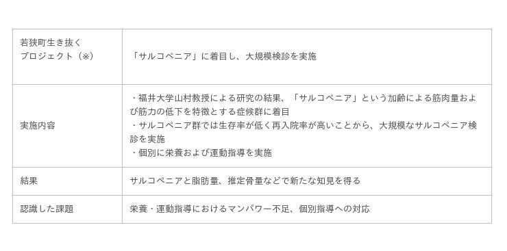 本プロジェクトの前身である「若狭町生き抜くプロジェクト」では、福井大学医学部山村 修教授がリードし、サルコペニア検出を主な目的とした拡大検診を2019年から実施し、対象希望者に対して集団の栄養指導および個別の運動指導を行ってきました。検診結果からは町内におけるサルコペニアの頻度やサルコペニアと脂肪量や骨量などとの関係において新たな知見を得ましたが、指導における医療従事者の不足が課題となりました。