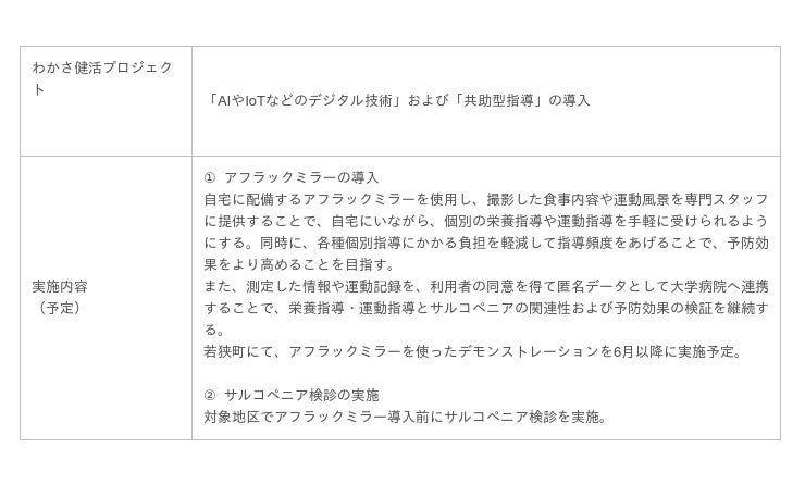 国立大学法人福井大学(学長:上田孝典、以下「福井大学」)、福井県若狭町(町長:渡辺 英朗)、アフラック生命保険株式会社(代表取締役社長:古出 眞敏 以下、「アフラック」)、ゼネラ株式会社(代表取締役 兼 チーフデジタルオフィサー:藤田 正則 以下、「ゼネラ」)、は、「わかさ健活プロジェクト」を協業し、AIやIoTなどのデジタル技術の導入を実施することで、健康寿命の延伸を目指します。