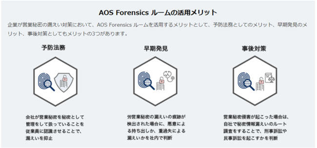 企業が営業秘密漏えい対策において、AOS Forensics ルームを活用するメリットとして、予防法務としてのメリット、早期発見のメリット、事後対策としてのメリットの3つが期待できます。