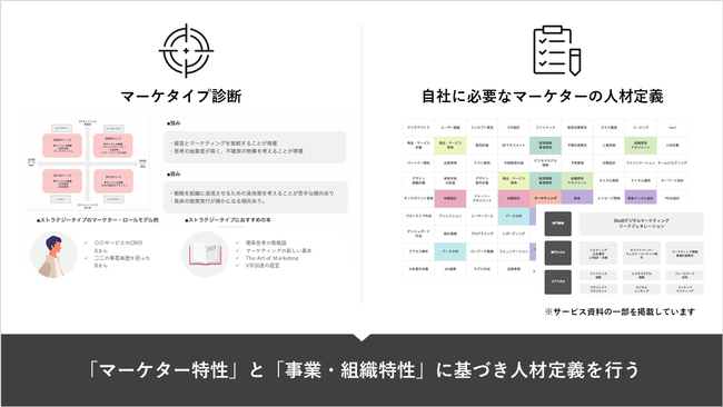 本サービスでは、マーケターの人材定義、育成教育プログラム提供、自走する仕組み構築を行うことで、マーケター・Next CMO人材の育成をしていきます。