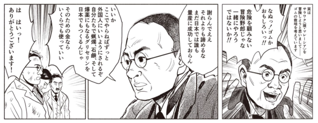 また、金子直吉は、冒険家の依岡省三と出会い、サラワク(現・マレーシアのサラワク州)でゴムの栽培事業に進出、神戸の敏馬にゴムの製造工場(現・ニチリン)も設立する。