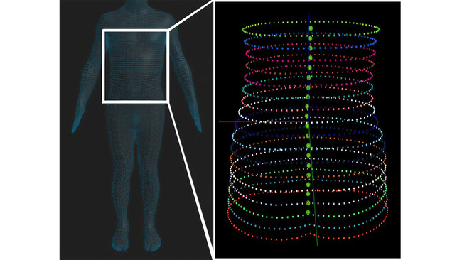 今回、研究チームは株式会社ZOZOとの共同研究により同社が開発した3D計測用ボディスーツZOZOSUIT(R)と検証用に開発した専用のスマートフォンアプリを用いて(図1)、主に若年世代の治療を必要とする可能性のある中等症(コブ角25°以上)以上の脊柱側弯症を検知できるか検討を行いました。被験者はZOZOSUIT(R)を装着した状態で1.5m離した位置に設置したスマートフォンのアプリの指示に従い、30°ずつ向きを変えていき、12枚の写真を撮影します。撮像した12枚の写真からアプリ内で自動的に体表の3Dモデルが生成されます。今回の研究ではこの3Dモデルから取得・再構成した各レベルの横断像(図3)から体幹のゆがみを示すZ値という固有値を定義し、検討を行いました。側弯症症例54例と非側弯症47例で検討を行ったところ、中等症(コブ角25°以上)以上の側弯症症例では非側弯症群やコブ角25°未満の軽症群と比較して、有意にZ値が高値であることが判明しました。(非側弯症群(コブ角?9°):平均Z値=20.7mm、軽症群(10°?コブ角?24°):平均Z値=21.4mm、中等症群(25°?コブ角?44°):平均Z値=32.3mm、重症群(コブ角?45°):平均Z値=35.2mm)またROC解析(注3)を行ったところ、最適なカットオフ値(注4)としてZ値=19.9mmと算出され、このカットオフ値に設定すると中等症以上の側弯症を感度95.3%、特異度58.6%で検出できることが確認されました。スクリーニング検査としては妥当な感度と考えられ、本技術が脊柱側弯症検知のスクリーニングツールの基礎技術として有用である可能性が示唆されました。
